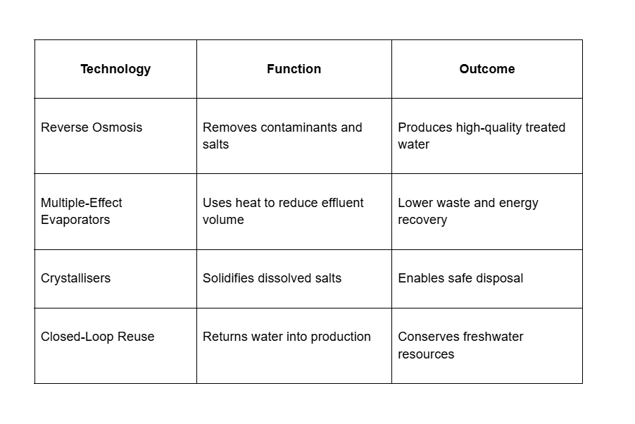 - Crystallisers: Converts concentrated salts into solid waste for safe disposal.