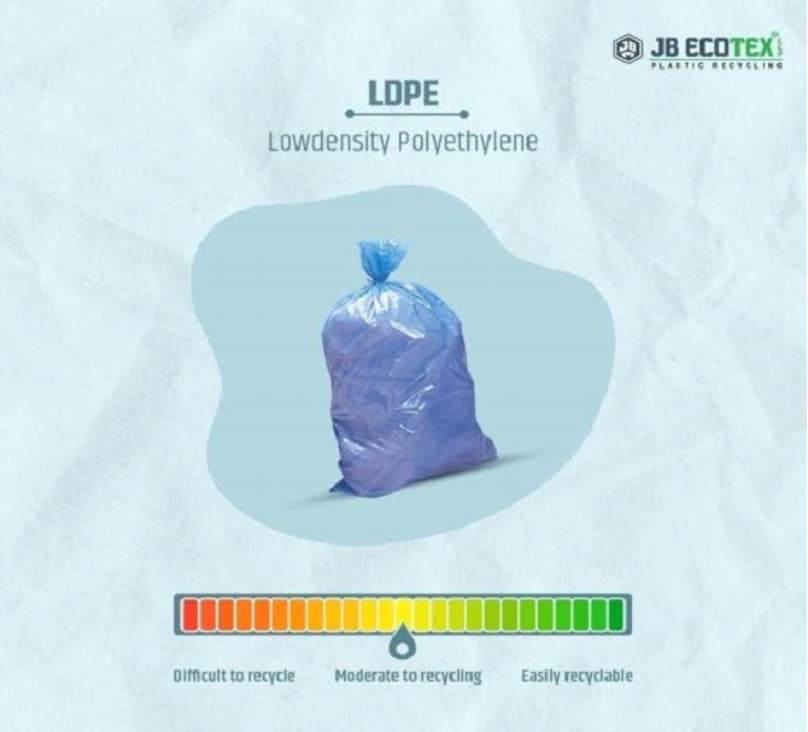 This kind of plastic is considered widely safe for regular storage use like milk pouch, Industrial packaging material. These are not commonly recycled, but it is being recyclable in certain areas. Recycled LDPE is used to make garbage cans, lumber, furniture, and many other products. For example- Plastic/cling wrap, sandwich, and bread bags, bubble wrap, garbage bags, grocery bags, and beverage cups.