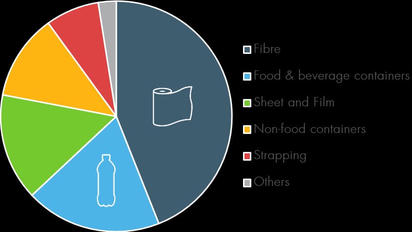 - Textile fibers:- Particular properties such as tensile strength, abrasion resistance and low moisture absorbing capacity, make the PET the most important raw material for manufacturing synthetics fibers. Textiles made of PET are crease resistant, weather resistant and fast drying, which makes them an excellent choice for manufacturing sports clothing- everyone can make a use of cozy polar fleece during winter time.